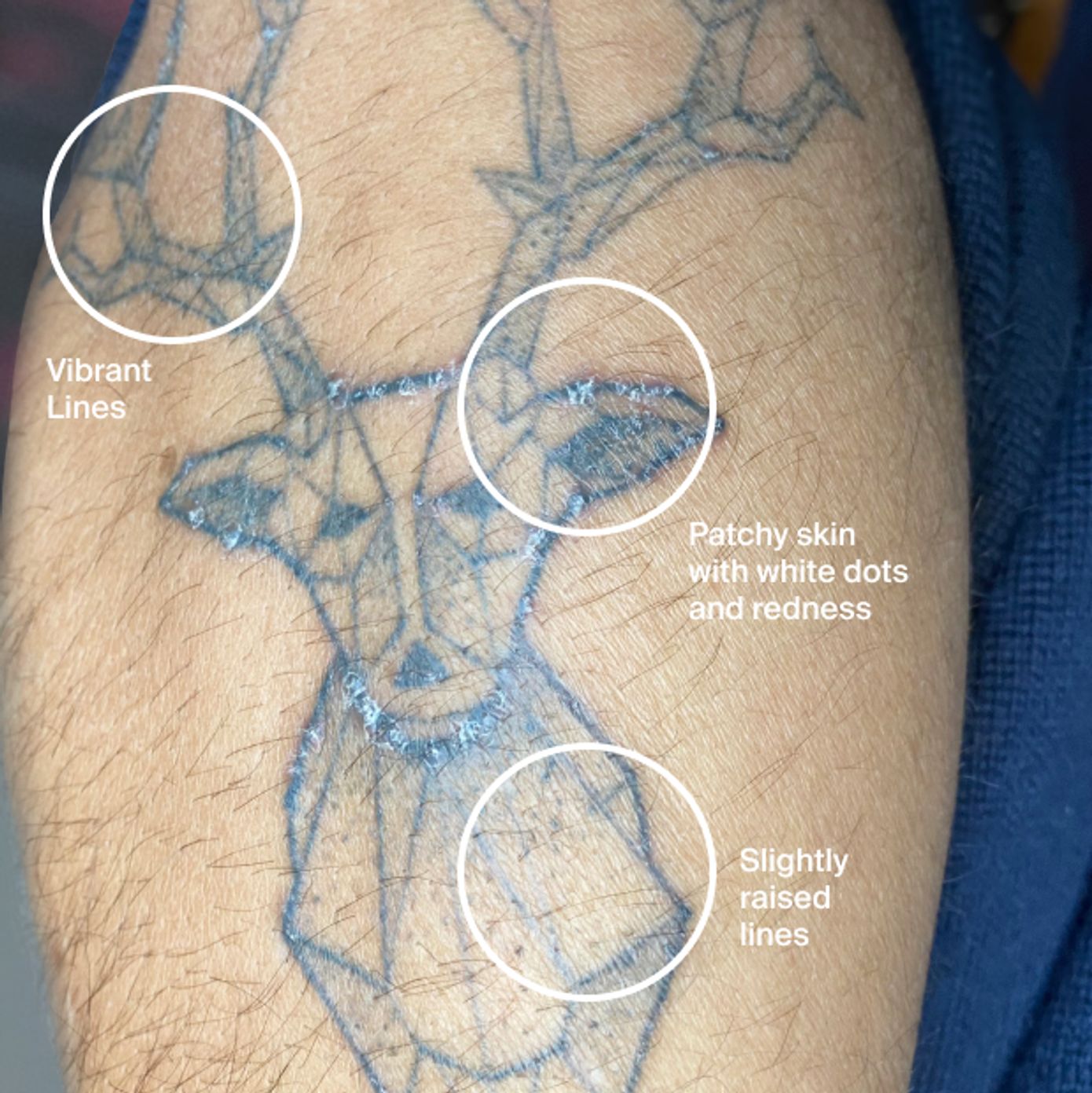 As your skin rebuilds, you might notice flakiness, redness, and raised lines or white dots. All of these responses from your skin are very normal. As your skin heals and flakes away on its own (resist picking at it!), you’ll have fresh new skin and a crisp tattoo. Keep following healthy tattoo healing habits, and don’t forget to keep your tattoo clean and lightly moisturized!