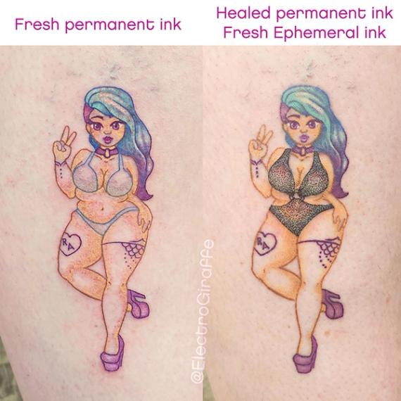 Sandy specializes in cute, colorful, and fun tattoos. Her studio, Radiant Body Art, is staffed by queer artists and provides a welcoming space for LGBT+ and neurodiverse clients. Sandy's style, which ranges from delicately femme to boldly kawaii, is heavily influenced by her background in the fashion industry, where she designed baby clothes and nursery décor. Her favorite use of Ephemeral is to combine permanent and made-to-fade inks to create tattoos that will change over time, slowly revealing a different design hiding below the Ephemeral layer!
