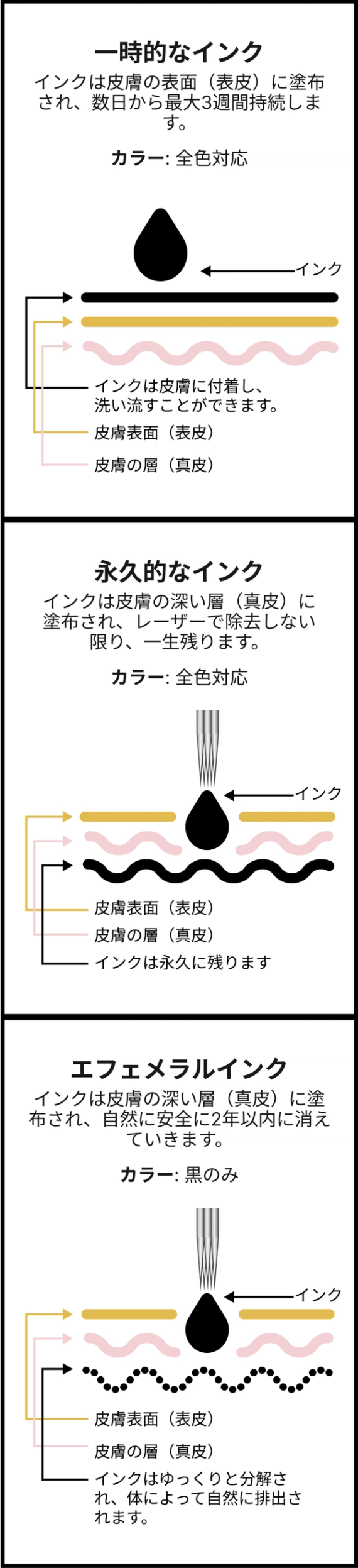 従来のタトゥーインクとは異なり、エフェメラルインクは時間とともに自然に体から排出されます。私たちのインクは、医療グレードのポリマーと、医療や化粧品に一般的に使用される認証済みの色素で作られています。
