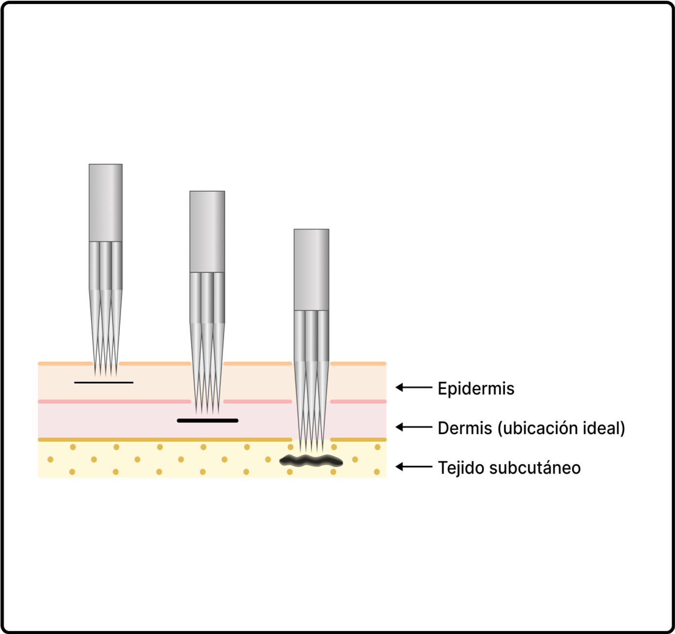 Si la tinta se deposita en la capa superior de la piel (la epidermis), se desvanecerá más rápido porque la epidermis se renueva rápidamente; si está demasiado profunda (tejido subcutáneo), se desvanecerá más lentamente porque hay menos agua para descomponer la tinta. La profundidad ideal es la dermis.
