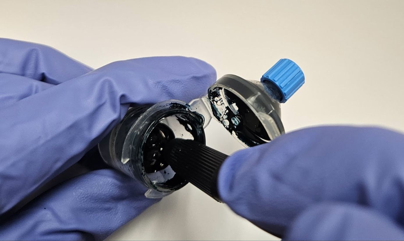 La tinta es de un color verde bosque oscuro, que puede parecer negro en ciertos tonos de piel.