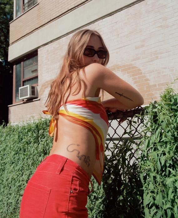 So a lower back tattoo of her favorite flower from her favorite manga movie was an obvious choice for her first ink. “My Ephemeral helps me express myself through a phase,” she explains, wearing true-to-the-era low-rise shorts and a g-string to show off the design. “I love showing my creative side not only with my thoughts but with my body. And who knows if I’ll want this in a year!”