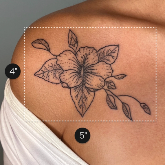 Sometimes a tattoo might look larger or smaller on your body depending on your own unique portions and the placement. For example: A smaller sized tattoo might look visually larger on your shoulder than your thigh. So we recommend thinking about tattoo size relative to your own body and placement rather than exact inches.